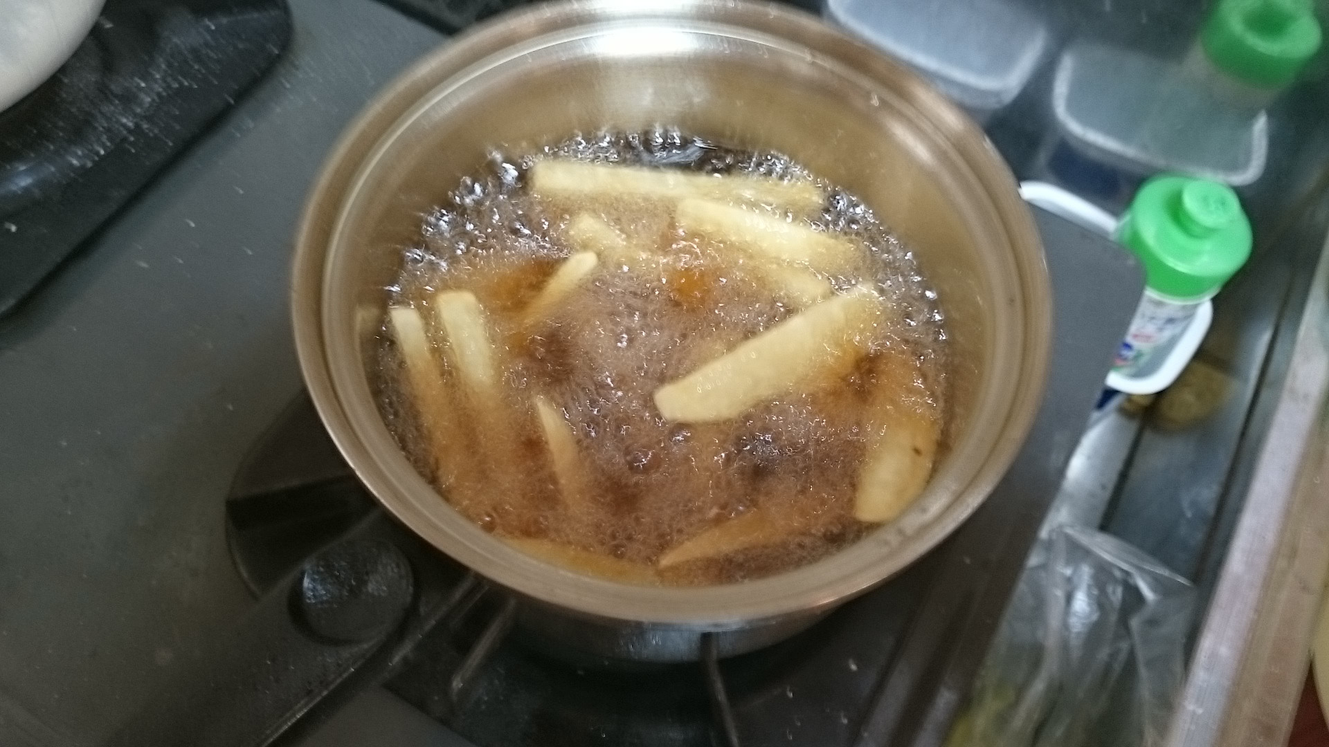 今回は生の状態のおジャガを揚げるので油の温度低下をあまり気にせず全部投入