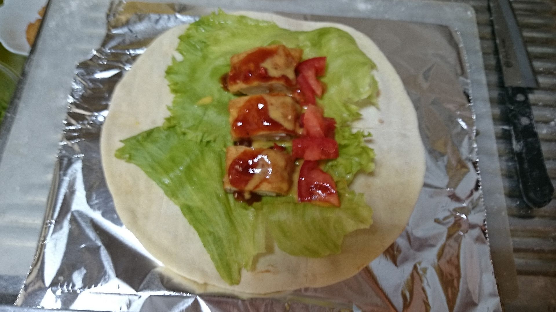 件のマヨとスイートチリソースを適量かけてカットトマトも入れました