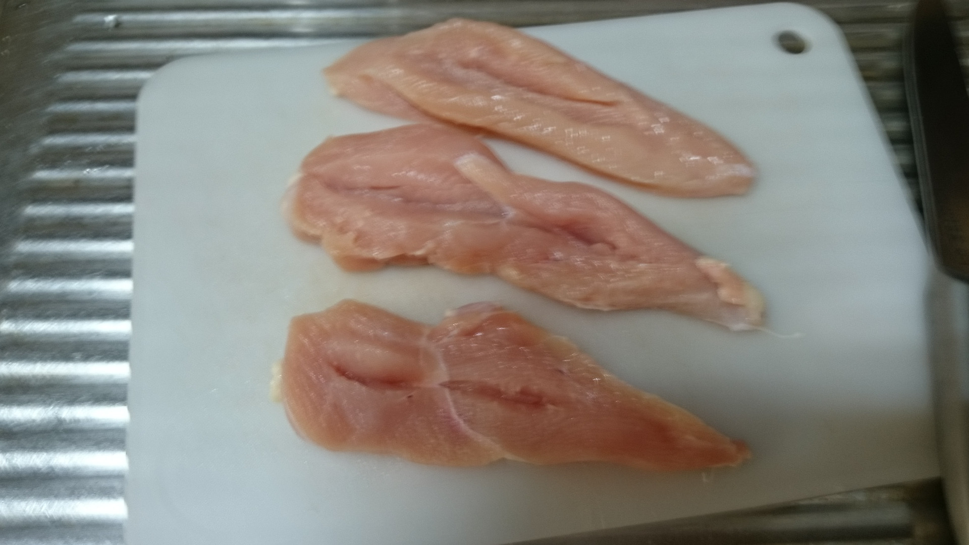 鶏ムネを食べやすい大きさに切って火が通りやすいように切り込みいれるよ