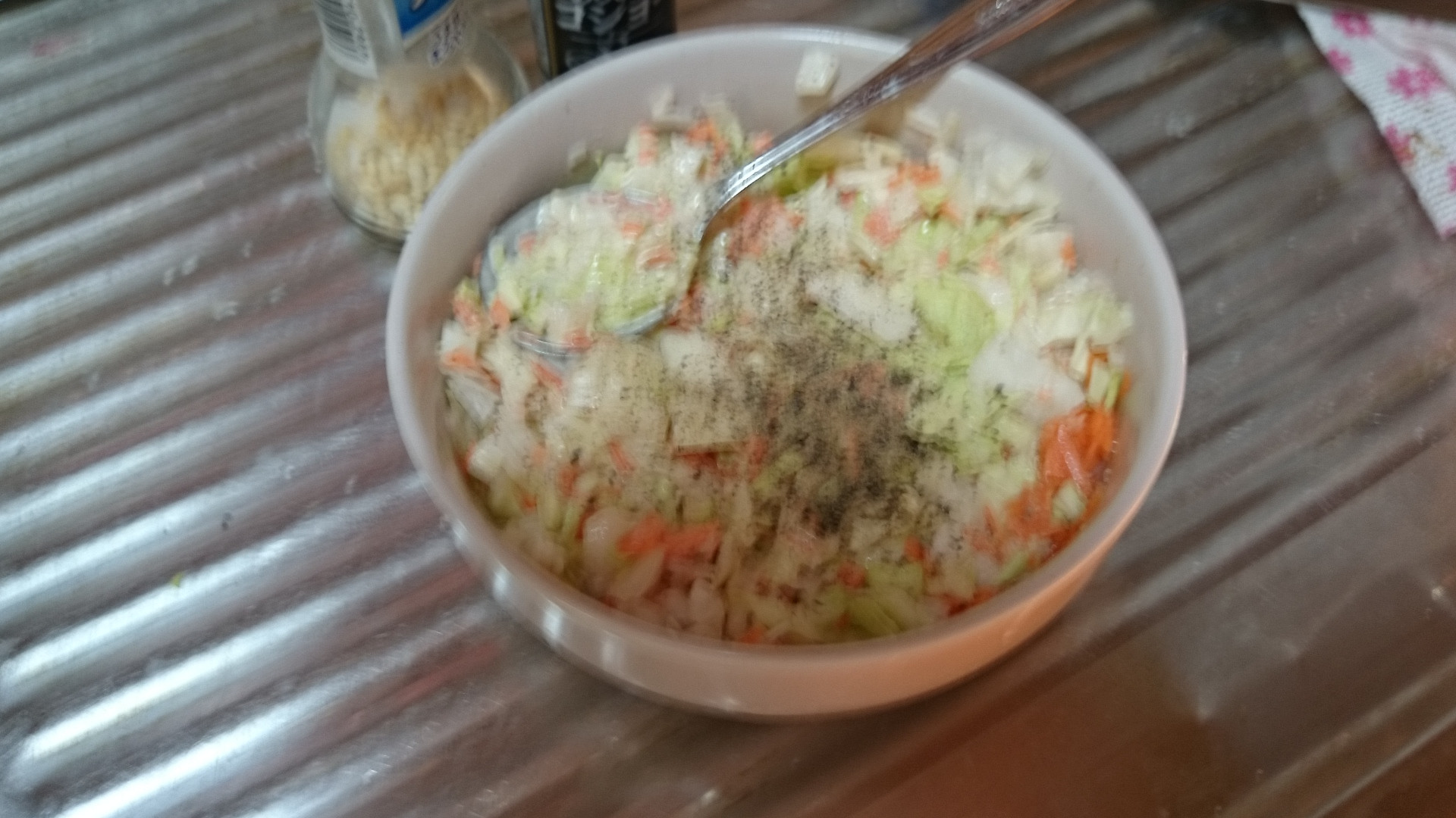 キャベツ、タマネギ、ニンジンを細かく切って塩コショウ