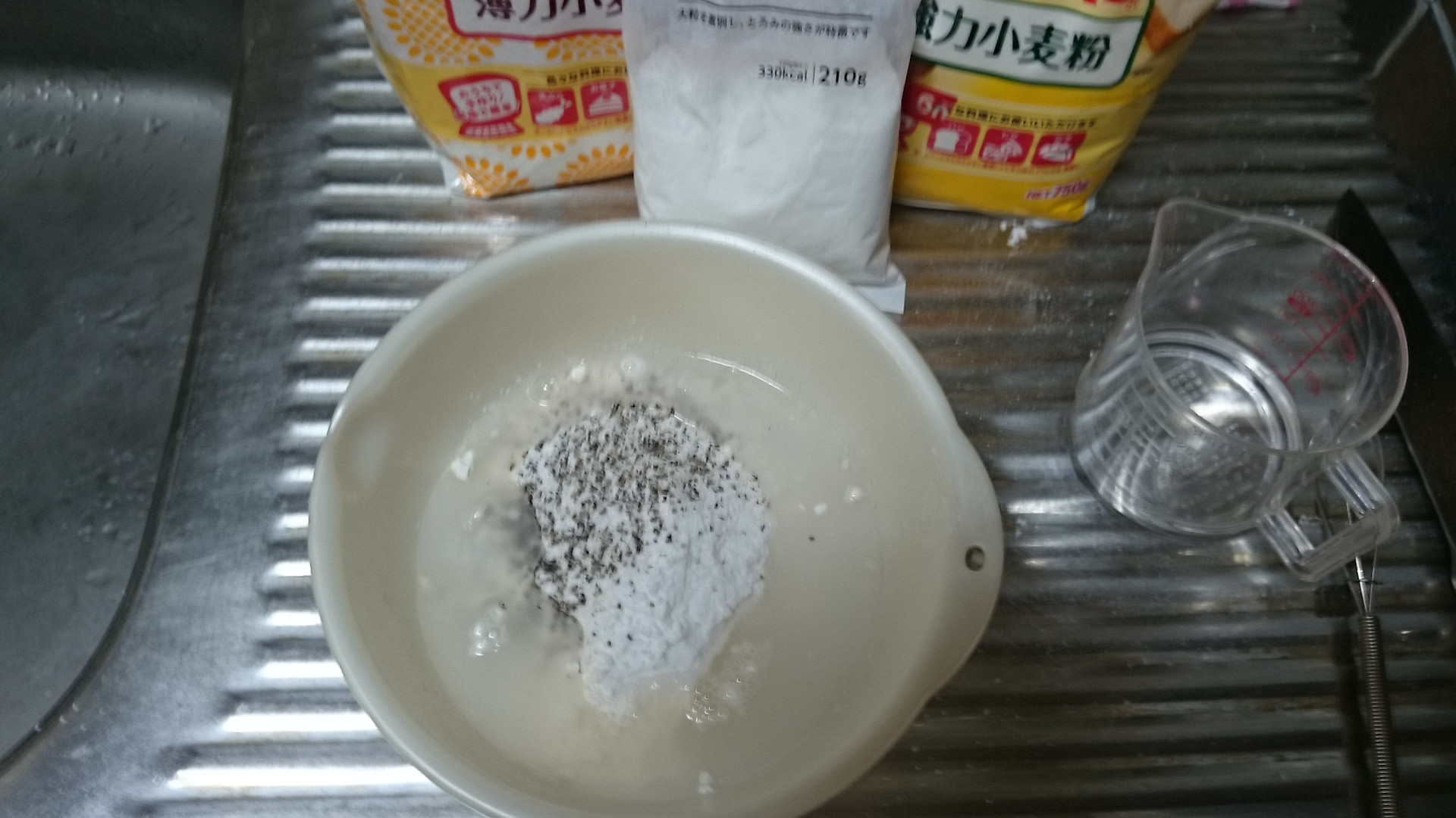 小麦粉と片栗粉とパン粉だいたい同じぐらいずつ混ぜるよ