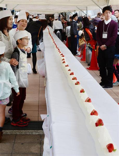 ギネス認定! 140メートルのロールケーキ 生クリーム180リットルと卵2400個使い完成 堺 – 産経WEST  高島屋泉北店(堺市南区)前の広場で8日、世界一長いロールケーキ作りに挑戦するイベントが開かれた。地域の住民ら約200人が協力して140・62メートルのケーキを完成させ、晴れてギネス世界記録に認定された。 続きはソース http://www.sankei.com/west/news/141108/wst1411080051-n1.html ↑ギネス記録に認定された、世界一長い140・62メートルのロールケーキ= 8日午後、堺市