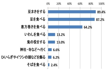 マーケティングリサーチを行うネオマーケティングは1月9日、同社が運営するアンケートサイト 「アイリサーチ」にて、全国の男女500名(20歳~59歳)を対象に「節分」をテーマにした調査を実施した。  節分の日に行った事があることの1位は「豆まきをする」で89.4%。2位は「豆を食べる」で87.2%、 3位は「恵方巻きを食べる」で64.2%という結果に。恵方巻きを食べる風習は主に関西を中心に 行われていたが、現在は全国へ広まったことを示唆する結果となった。 http://news.mynavi.jp/news/2013/01/29/218/index.html 問「あなたが節分の日に行なったことがあることを教えてください」