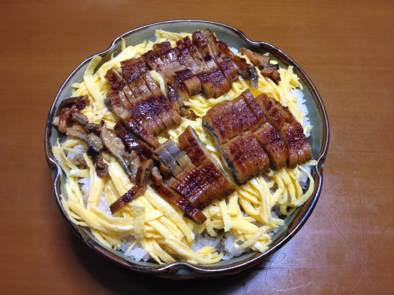 恐らくこの市販のは蒸して焼いてるので、錦糸卵が挟まったうなぎ丼というのが正しいんじゃないかな