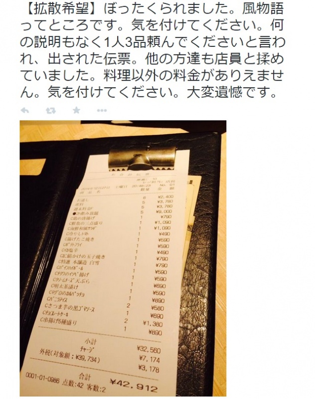 客から異常なほど高額な料金を受け取っている「ぼったくり居酒屋」として、先日来ネット上で批判されていた新宿の居酒屋「風物語新宿店」を経営する居酒屋チェーン、株式会社海野屋(東京都新宿区、太田欣也社長)が公式ページに謝罪文を掲出した。 会社側は「弊社の(従業員)管理不足」「従業員の中には不正な会計処理をしてしまう者がいることを把握できておらず、十分な対策を施しておりませんでした」とし、調査チームを作り外部の弁護士にも協力を仰ぎ再発防止に務めるとしている。 (ツイッターの投稿より) 続きはソース http://news.livedoor.com/article/detail/9627424/ 海野屋トップページ お詫びとお知らせ http://www.uminoya.biz/