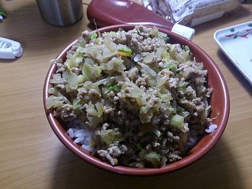 俺はハマると一週間ほど同じものを食いつづけるんだが、これはちょうどひき肉と玉葱のみじん切りを玉子で閉じたものに飽きてきて卵じゃなくて野菜を入れてみたら出来たもの