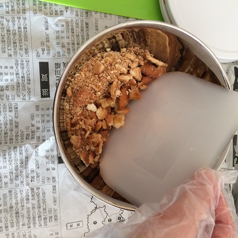 砕いたら溶かしたバターをいれて馴染ませてから型に敷き詰めます。