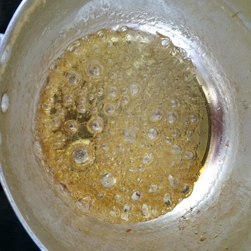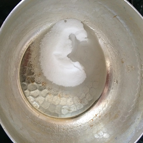 小鍋にキャラメル用の砂糖と水小さじ1弱火にかけます