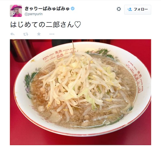 歌手やモデルとしてマルチに活躍するきゃりーぱみゅぱみゅ(22歳)がツイッターで、人気店ラーメン二郎に行ったと報告。