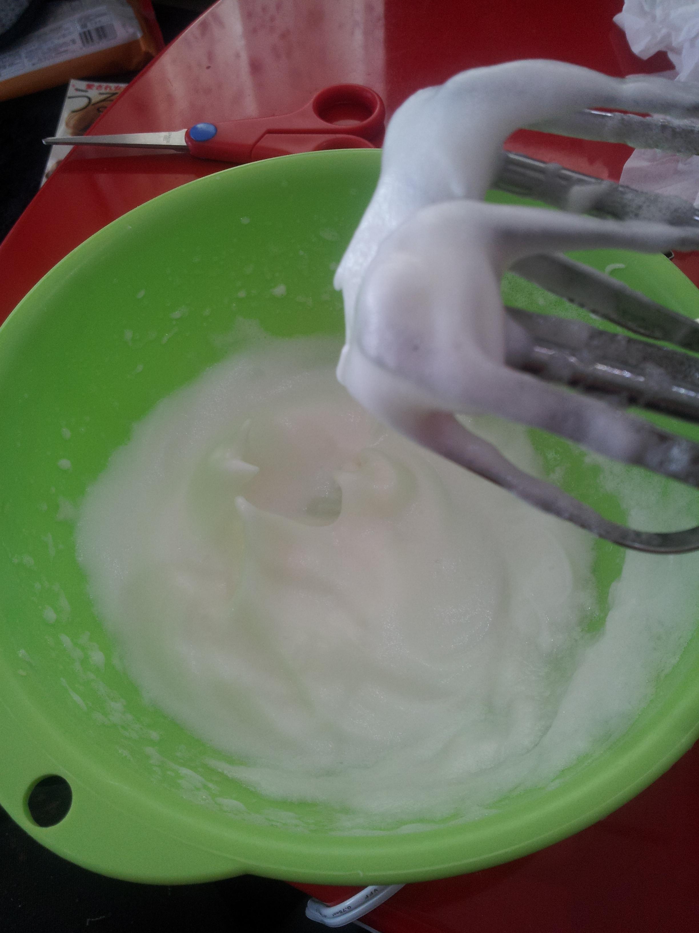 卵白をボウルに入れて、ハンドミキサーでメレンゲを作るよ!