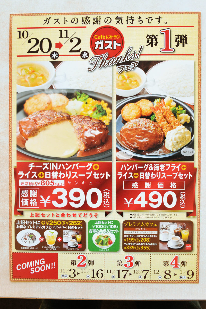 sssp://img.2ch.net/ico/yukidaruma_1.gif ガストがハンバーグのスープセットを390円で販売、サイゼリヤを超える安さに ファミリーレストランチェーン「ガスト」が、人気メニュー「チーズINハンバーグ」のスープセットを390円(税込)に大幅値下げする「Thanks! フェア」を開始します。 もともと805円のセットを半額以下の390円で販売するという驚きのキャンペーンは、10月20日(木)から11月2日を第1弾とし、以降第4弾まで用意されているとのこと。 これが10月20日(木)から販売開始される「Thanks! フェア」のメニューです。 b7ba55a0.jpg