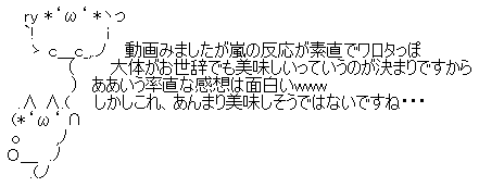 アイドルグループ「嵐」の二宮和也さんと松本潤さん、女優の上戸彩さんが、 テレビ番組で韓国の絶品スイーツを食べた際に微妙な顔をした。 たまたま美味しくないものに当たってしまったのかもしれないが、 「この世で一番美味しい」はずだっただけに、インターネット上で話題になっている。 2012年4月26日放送の「ひみつの嵐ちゃん!」(TBS系)のゲストに上戸さんが登場した。 二宮さん、松本さんと部屋でくつろぎながらトークや料理を楽しむという企画の中で、 番組のディレクターから「FROM KOREA」と書いた段ボールの荷物が届けられた。 箱を開けると、「上戸彩さんが『この世で一番美味しい』と唸ったスイーツ『パッチュッ』 を特別に韓国から今朝お取り寄せ致しました」と書かれたメッセージカードとともに、 「パッチュッ」が入っていた。パッチュッはあずきを使った韓国の伝統的なおかゆで、 日本のおしるこに近いが、甘さひかえめで塩気が強いという食べ物だ。 松本さんが水筒からおわんにパッチュッを移すと、もちがゴロッと落ちてきた。 上戸さんは「わ~うれしい~」と終始テンションが高かったが、松本さんはもちが落ちる たびに「うわっ。何これ」「うわうわうわ」と半笑いで言い、二宮さんに「反応が『おぉ~』 とかじゃなくて『うわっ!』て言ったもんね」と突っ込まれていた。 いざ上戸さんが食べてみると、「うーん…」と、うなったまま黙ってしまった。 表情はすでに笑顔ではなく、しかめ面のようにも見える。 すると二宮さんが「ねえ、おいしい?」と聞いた。上戸さんは「え?おいしくない?」と返したが、 二宮さんは「おいしいよ。けど、俺たちが思ってたテンションと違くない?」と言い、松本さん もそれに同調した。 上戸さんは「わかんないかなー、このおいしさ。 本当は(黙々と食べたいから)しゃべりたくないの」と言い返し、その後黙って食べ続けた。 しかし上戸さんはパッチュッが登場する前に3人で「生姜しゃぶしゃぶ」という鍋料理を作った際、「 おいしーい!」「やばーい!」と満面の笑みで言いながら食べていた。 (続きは>>2以降) http://www.j-cast.com/2012/04/30130814.html?p=all