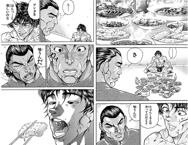 まあ刃牙の肉体なら、あの量は朝の軽食な感じで、昼前にちゃんと食って、午後におやつ(一般人の食事レベル)食って、夜にも食うんだろうな