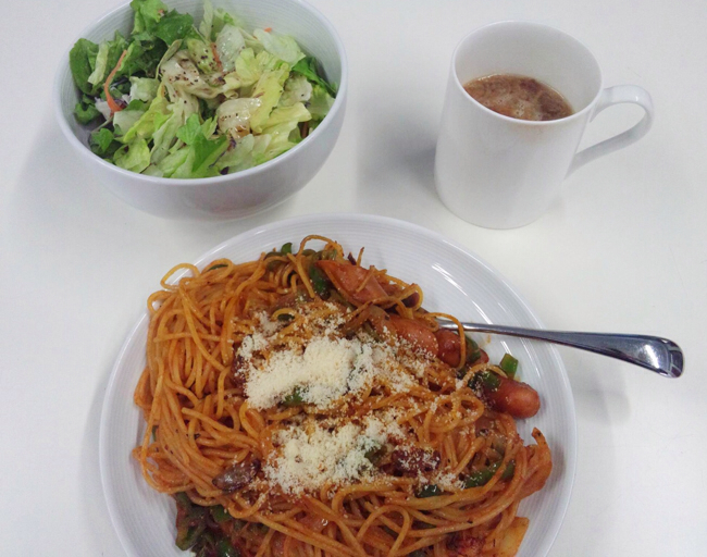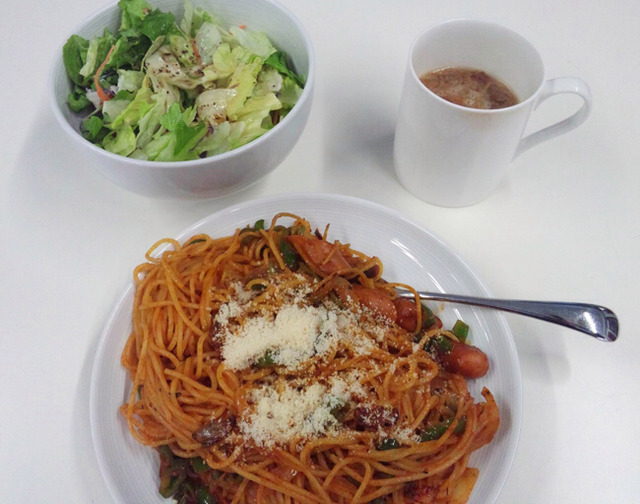 8, サラダとパスタ、スープを食卓に並べて出来上がり