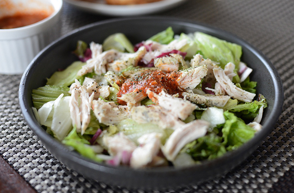 サラダ+チキンかと思ったらレトルトの鳥をモソモソ食ってんのか