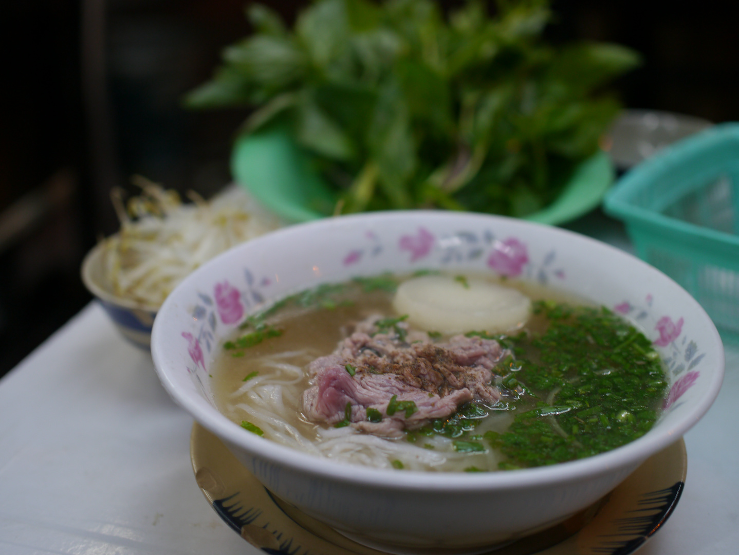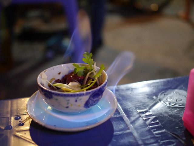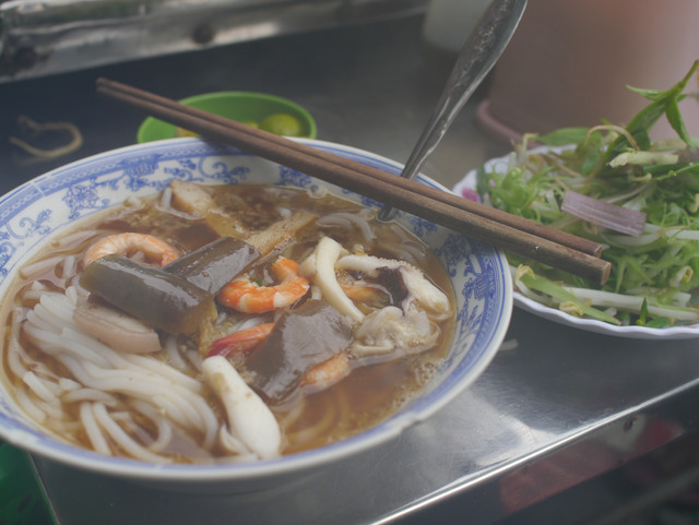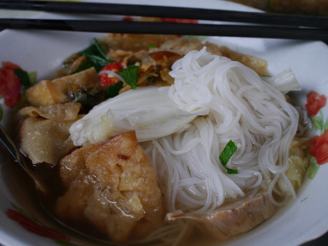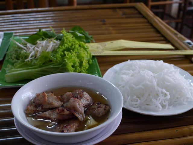 豚肉の炭火焼きが入った甘酸っぱいたれに米粉麺(ブン)を付けて食べます