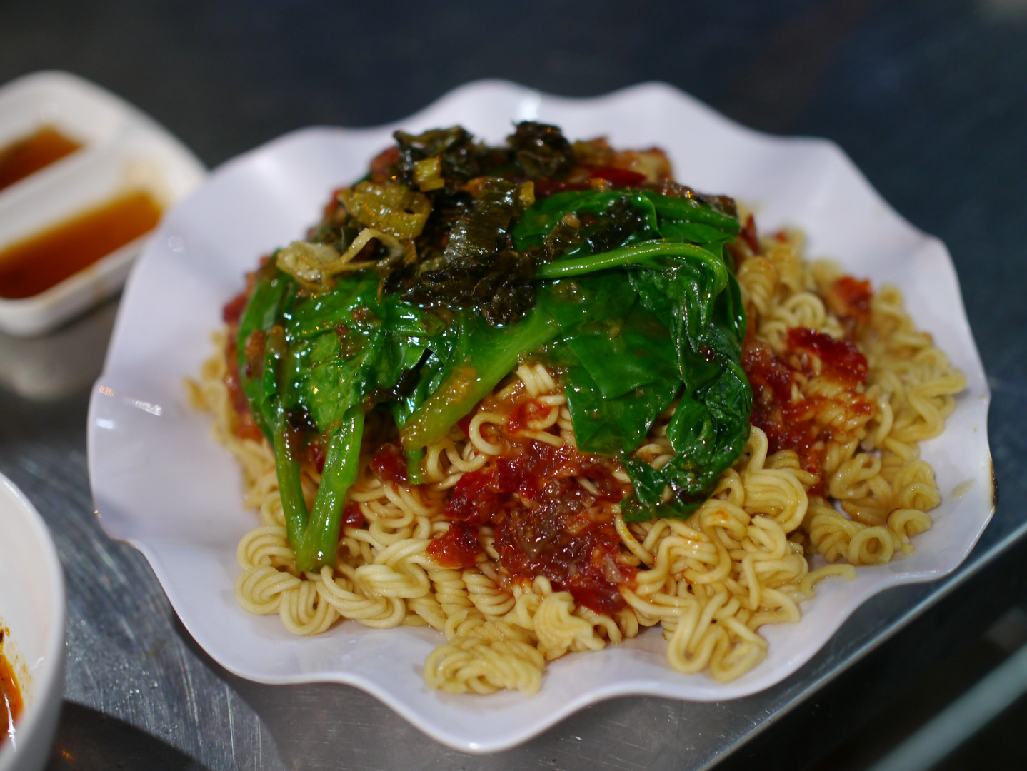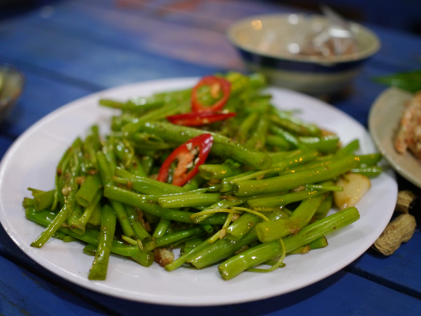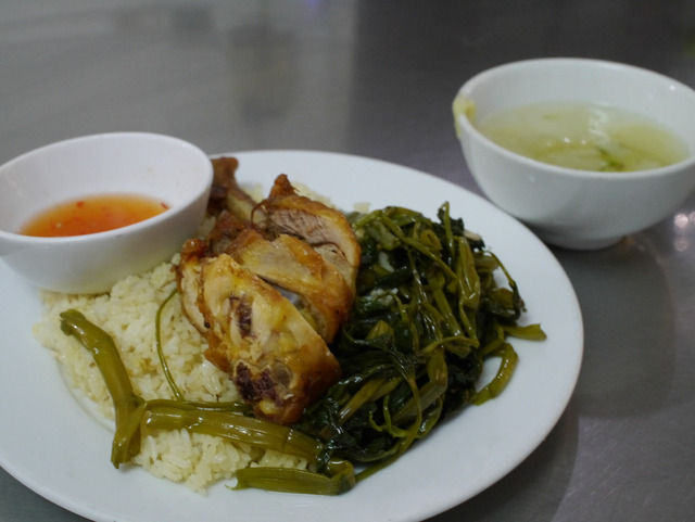 ご飯はニンニク風味で、付け合わせは空心菜の炒め物