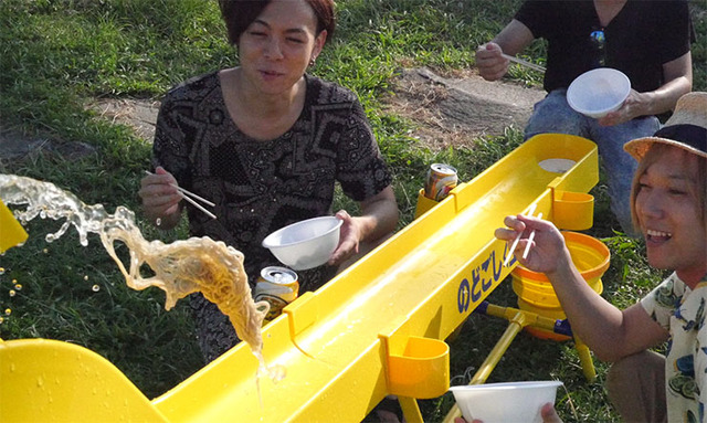 この流し素麺台って、「流して」なくて、高飛び込み台のように慣性落下してるだけじゃ?