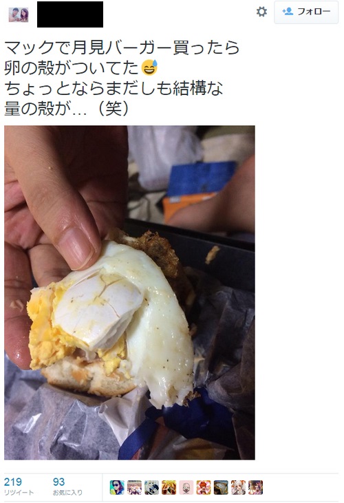 マクドナルドの月見バーガーを購入したら殻が付いていたと報告がTwitterに投稿されていた。写真を見てみるとガッツリ殻が