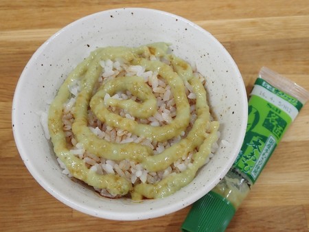 チューブの練りワサビをごはんにかけて食うと激ウマ?ワサビを適量ご飯にかけ、醤油をたらして食べるだけ