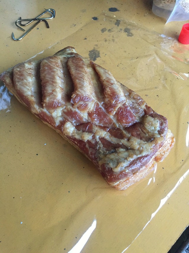 このレシピはスモークウッドで煙を乗せるタイプのだから、中まで完全に火が通ってない。食べるときは必ず火を通すべし。うまいぞ!