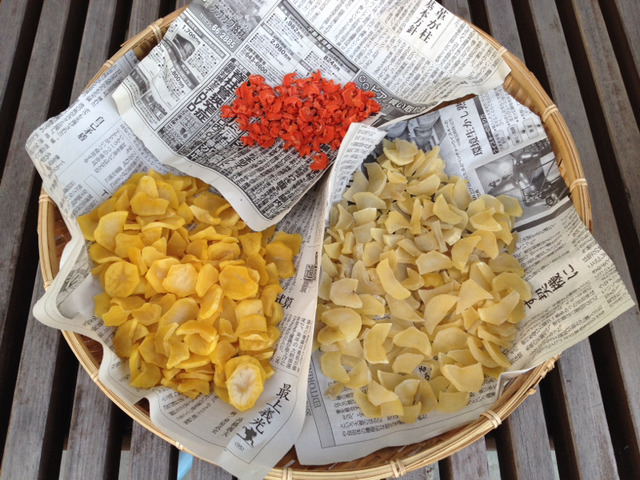 3日後 ジャガイモとニンジンは干し完了。 タマネギはまだまだ。