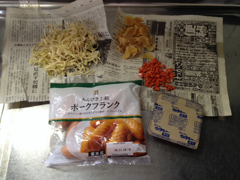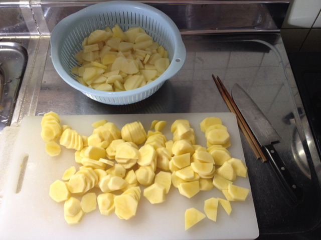 じゃあカレー作ります。 材料です。 タマネギは5日干しました。 それでもカラカラにはならずに一部しっとりしてます。