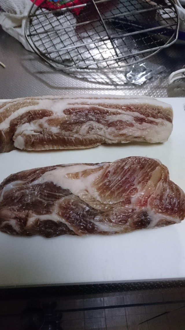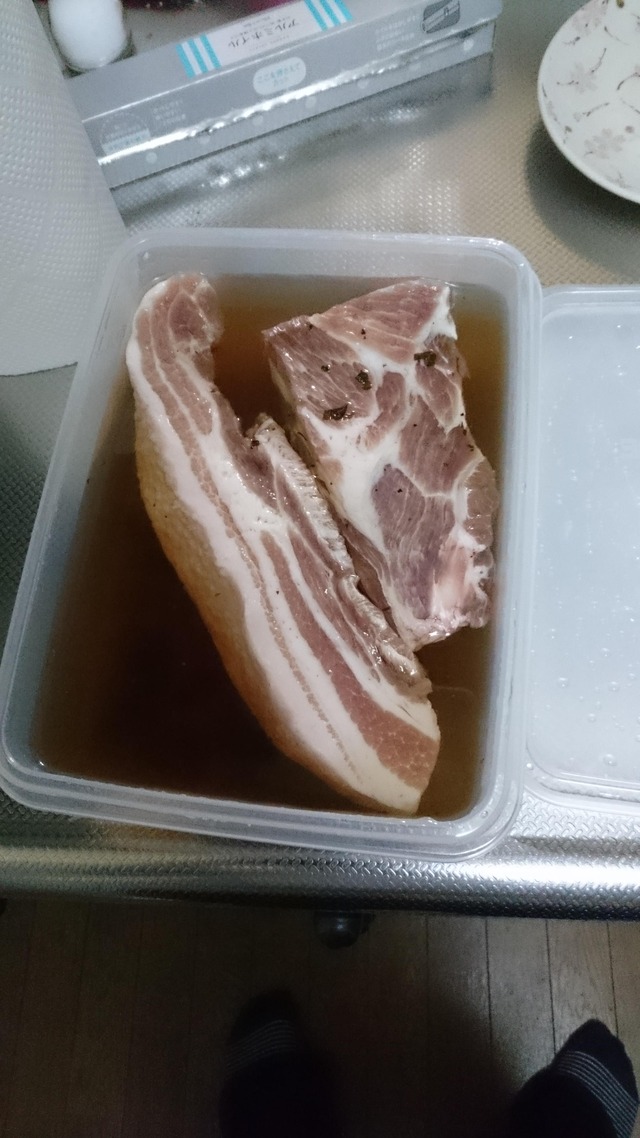 次は塩抜きって言って肉に染み込みすぎた塩分を水に浸けて抜くんや