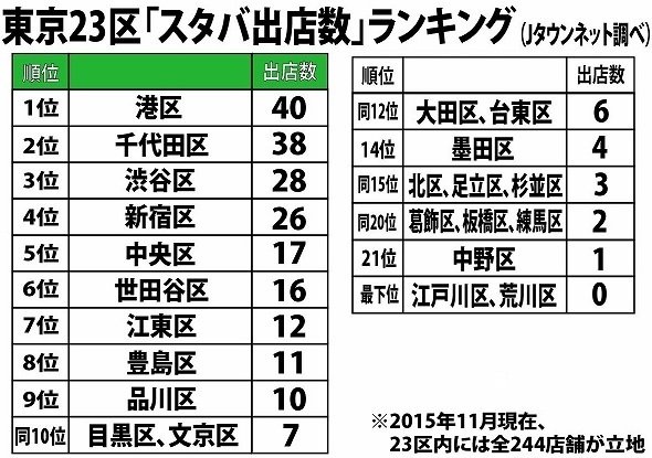 東京都のスターバックスの出店数、江戸川区と荒川区にはスタバがなかった!