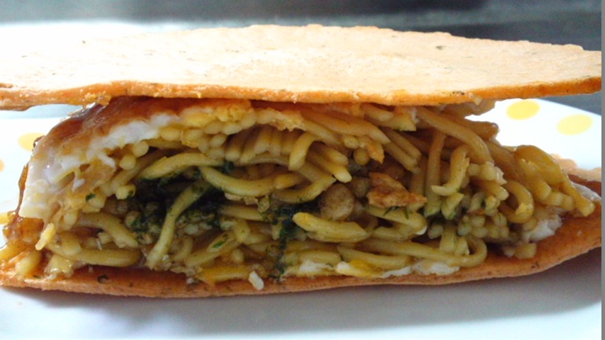 えびせんに卵(と焼きそば)挟んだだけのお手軽料理やで