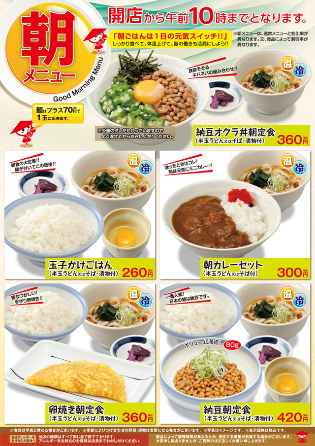 sssp://img.2ch.sc/ico/hare.gif ※開店から午前10時までは朝専用メニューのみの販売となります。(一部の店舗を除く) ※日替わりセット・期間限定新メニューは午前10時からの販売となります。(一部の店舗を除く) ※表示価格は税込みです。 ※セットメニューは商品により割引価格が異なります。 ※店舗によっては、お取り扱いの無いメニューもございます。 ※食器は写真と異なる場合がございます。 ※季節により食材の一部が写真と変わる場合がございます。 http://www.yamada-udon.co.jp/menu/food/new.html