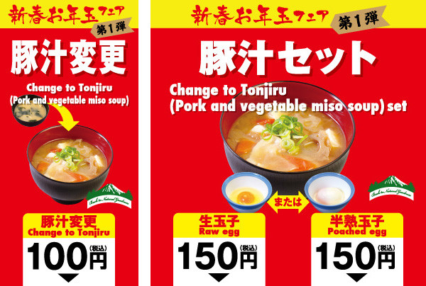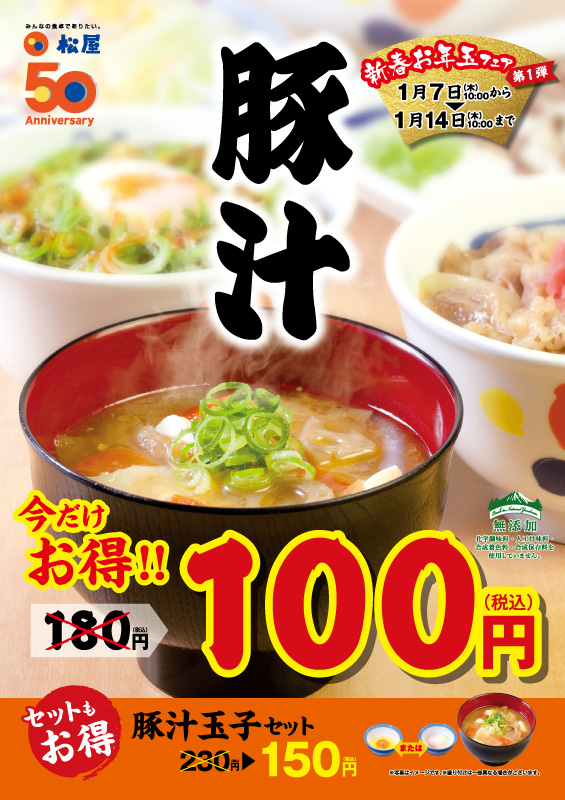豚汁ワンコイン100円フェア開催! 2016年1月7日(木)10時から1月14日(木)10時まで、「豚汁ワンコイン100円フェア」を開催いたします! 寒い時期にぴったりの‘あつあつ具だくさん’『豚汁』と、玉子とセットになった『豚汁玉子セット』を、通常価格より80円引きにてご提供いたします。 いつものお味噌汁を「豚汁」に変更して、ちょっと贅沢をしてみてはいかがですか。 この機会にお得な「豚汁」をお召し上がり下さい。 商品名 豚汁 180円 → 100円 豚汁玉子セット 230円 → 150円 ※豚汁玉子セットは、生玉子または半熟玉子をお選びいただけます。 ※お持ち帰りいただけます。 ※上記商品の価格は全て税込です。 【フェア期間】 2016年1月7日(木)10時~1月14日(木)10時 【対象店舗】 一部店舗を除く松屋 http://www.matsuyafoods.co.jp/2016/01/04/3141/