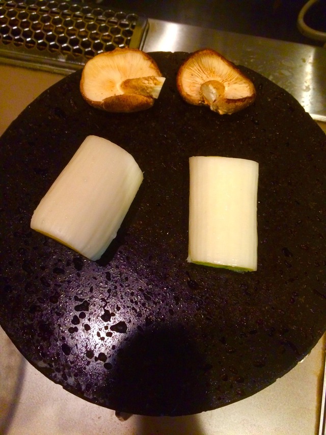 溶岩でまずは付け合わせの下仁田ねぎと原木しいたけを焼いておく…
