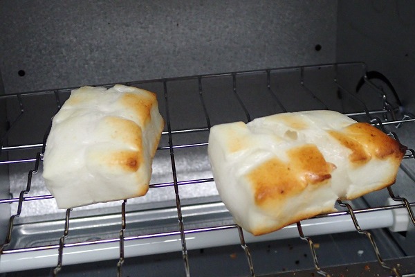 一般的な上の写真では、焼いた餅の表面が硬くなるので納豆のからみが悪い