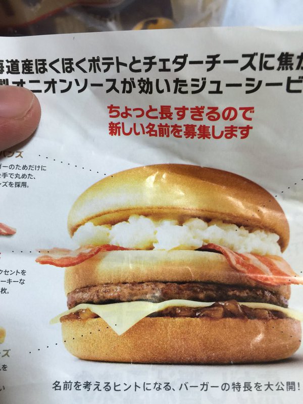 マクドナルドが名前を募集している新しいハンバーガー「北海道産ほくほくポテトとチェダーチーズに焦がし醤油風味の特製オニオンソースが効いたジューシービーフバーガー(仮称)」について、最もしっくりくるネーミングが誕生したと話題になっている。 つね  pierot70 名前募集バーガー買って来たけど、詐欺バーガーで決定だな! https://twitter.com/pierot70/status/694494786556825600 マクドナルドにはありがちな宣材写真と実物が全く異なるいつものパターンで、見事に詐欺バーガーという名前が誕生。Twitterでは9,000以上ものリツイートを集め、賛同の声が殺到した。 ▼公式HPで公開されている代表的な名前はこちら。現状では「北北(ほくほく)バーガー」が一番投票数が多い。 続きはソース http://netgeek.biz/archives/65660