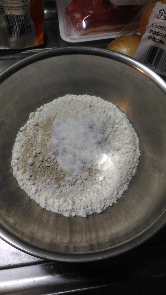 サラダ油以外の生地の材料です。 ここに50℃ぐらいのぬるま湯を注ぎます。 ティファールで適当に沸かしたものでOKです。