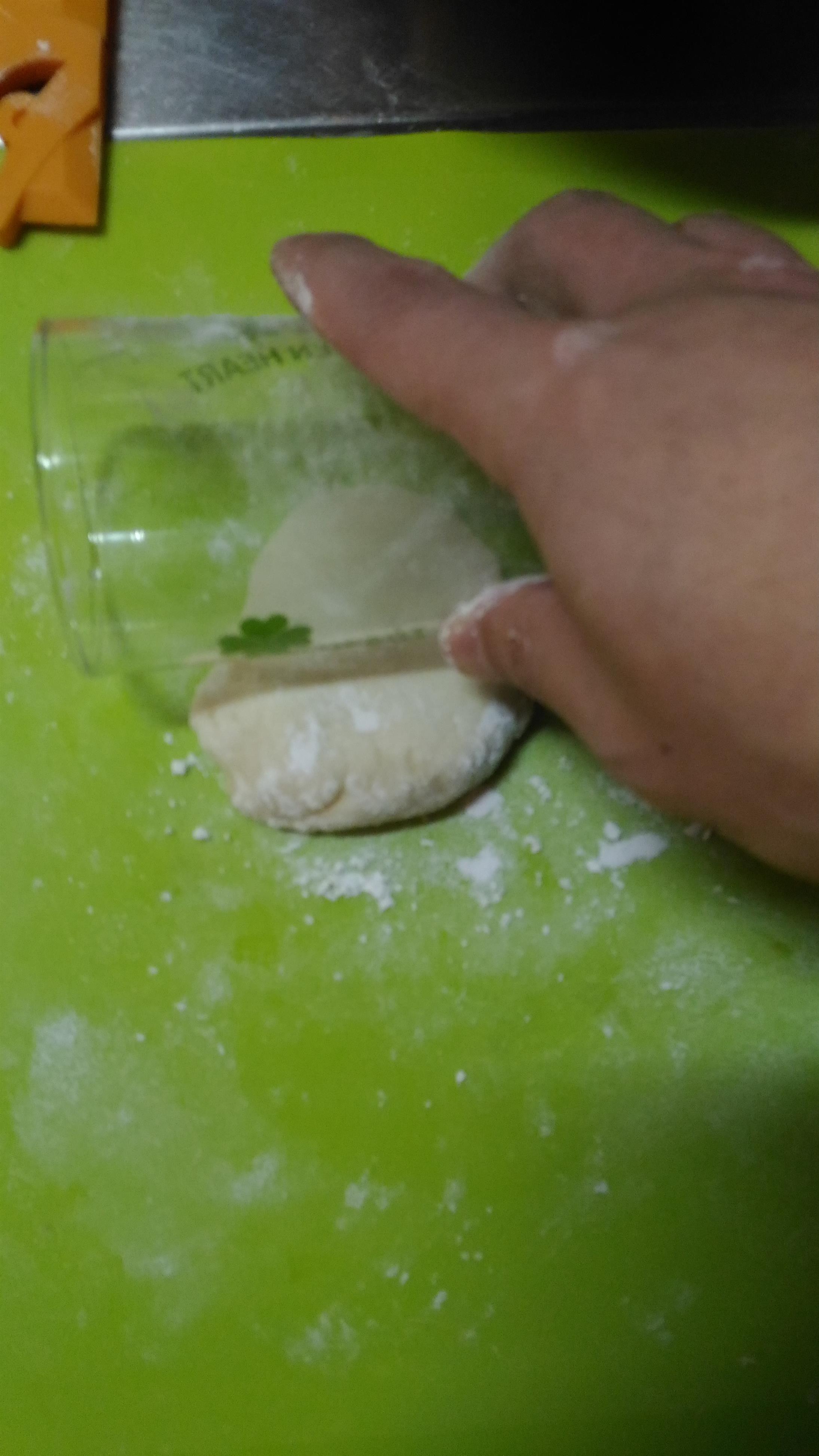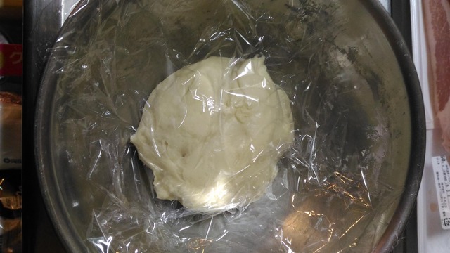 8等分にした生地を麺棒で伸ばす。 伸ばした生地に餡をぶち込みぎゅっぎゅ!と包む。 生地が乾いてうまくくっつかないーとかいう話しも聞くがいつもちゃんとくっつく。
