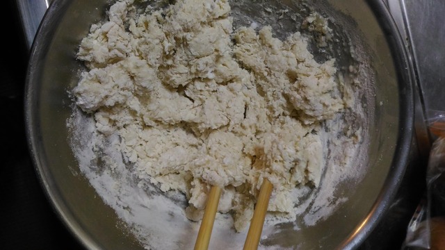 菜箸で適当に混ぜた後、手でこねてこねて、 その後にサラダ油大匙1を混ぜてそれが全体になじむまでこねた後です。