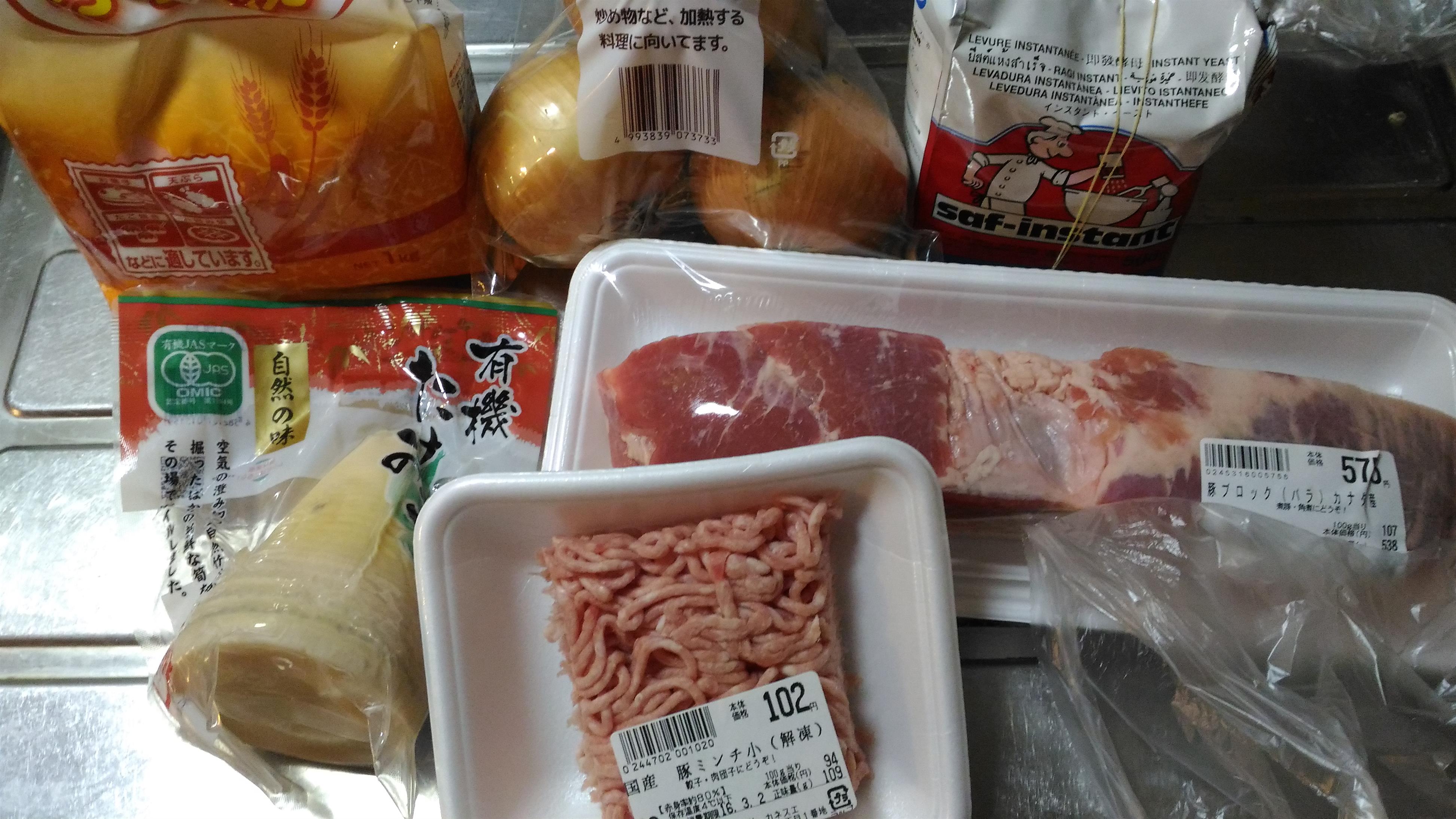 生地 小麦粉200g イースト3g 砂糖15g サラダ油大匙1 餡 たけのこ半分 たまねぎ1/2個 豚バラブロック100g 豚挽き肉100g 醤油大匙1/2 オイスターソース大匙1/2 ごま油大匙1/2 酒大匙1 胡椒適当