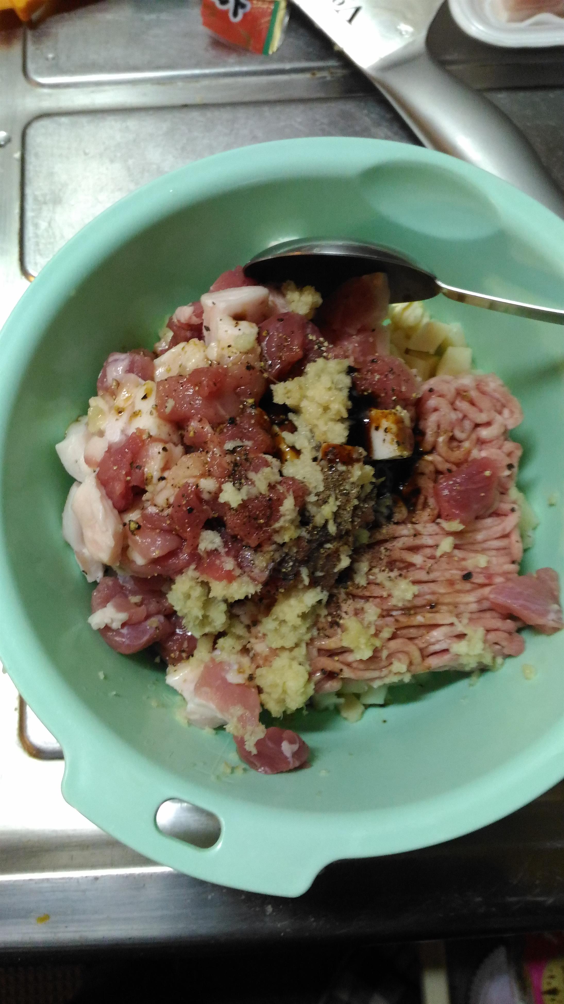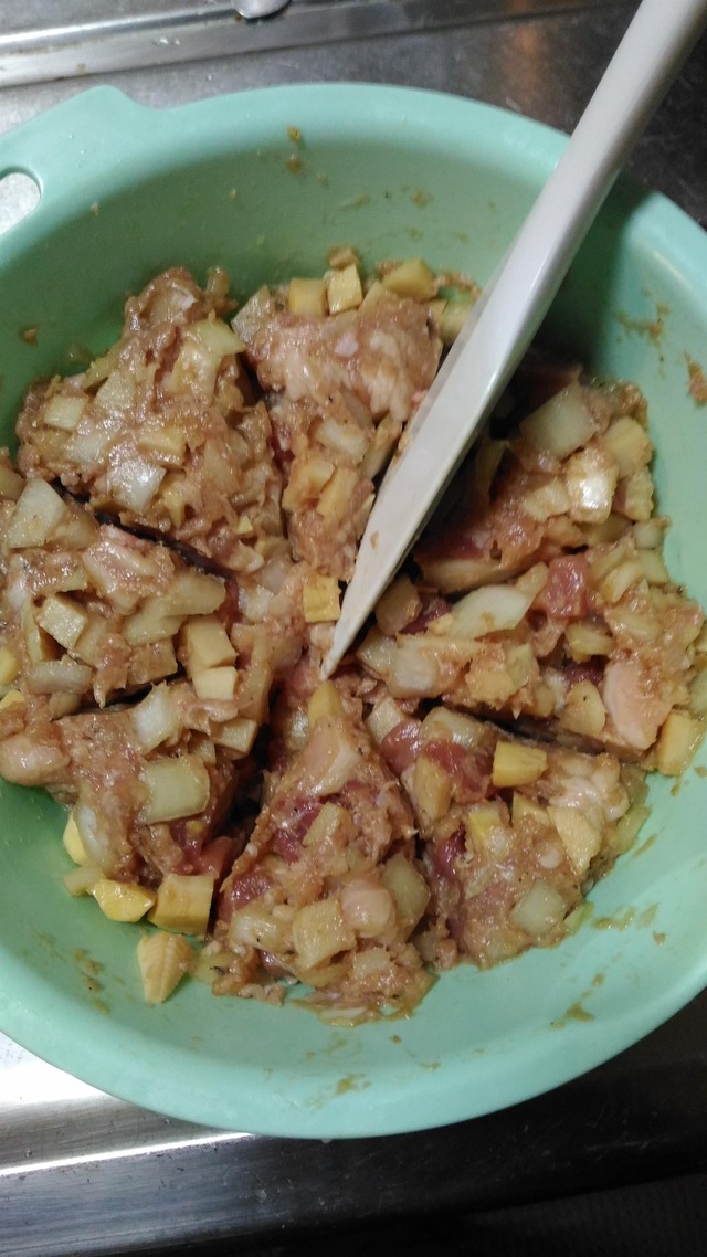 たけのこ、豚バラブロック、たけのこをみじん切りに。 それ以外の材料を加えたところです。 それを手でまぜます。何度かヘラとかでやろうとしましたが、 やっぱり手でやったほうが最終的に労力が少なかったです。