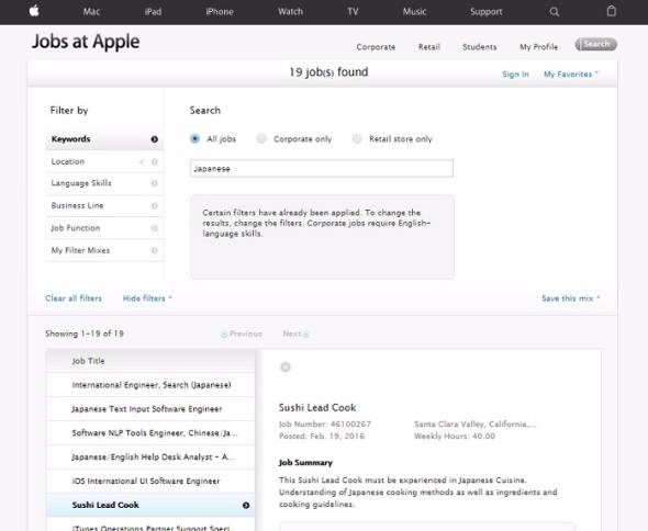 Appleが自身のサイトのリクルーティングページで寿司職人を募集しています。 https://jobs.apple.com/us/search#&ss=Japanese&t=0&so=&lo=0*USA&pN=0&openJobId=46100267 「Job at Apple」には、「iOS International UI Software Engineer」「iTunes Operations Partner Support Specialist」と並んで確かに「Sushi Lead Cook」の文字が。あぁ……なんたるうらやましきことや。  募集要項を見てみると、Appleの寿司職人は日本料理の経験を持っていなければならないとのこと。基本的な寿司知識はもちろんのこと、1~2年の調理経験、ナイフ取扱いのスキル、ガイドラインに従って調理すること、衛生面への配慮、リーダーシップ、プレゼンテーション能力、コンピューターリテラシー、追加責務の実行などが求められています。な、なんだか最後の方、だんだんすごくなってる……! 続きはソース http://nlab.itmedia.co.jp/nl/articles/1603/03/news089.html
