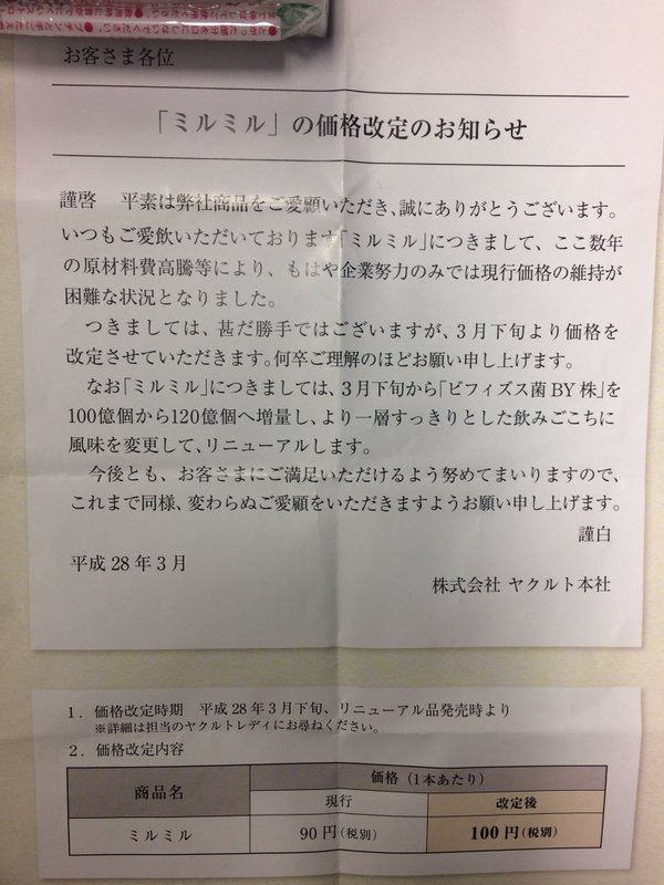 sssp://img.2ch.sc/ico/anime_kuma01.gif ヤクルトが発売する『ミルミル』が3月下旬より現在の90円から100円に値上げされるという。 「ミルミル価格改定のお知らせ」という紙には次の様に書かれている。 「ここ数年の原材料費高騰等により、もはや企業努力のみでは現行価格の維持が困難な状況となりました」としており、3月下旬よりミルミルを10円値上げするという。 続きはソース http://gogotsu.com/archives/17139