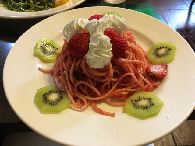 昔食ったイチゴスパは下にイチゴ色に染まった油が溜まってたな