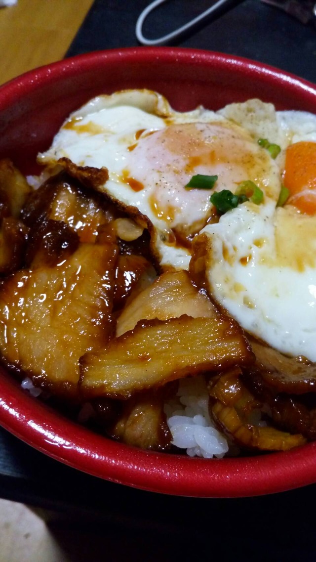 半熟卵の黄身がとろりと甘辛い濃い目の味付けの角煮に絡み一層コクを増し、
