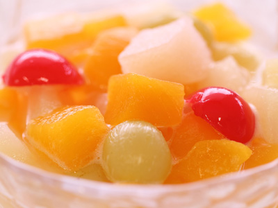 給食でフルーツミックス缶詰をヨーグルトで和えた