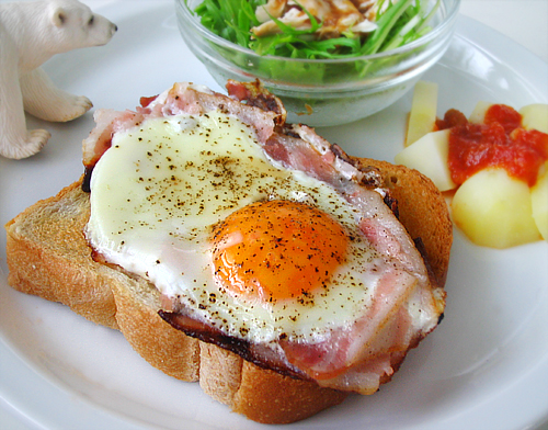 別々に焼いてカリカリベーコンに半熟の黄身つけたほうが美味しそう