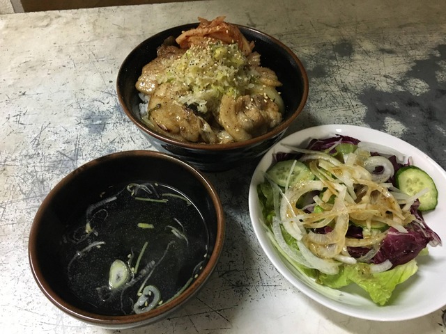 チョレギサラダ、ワカメスープ、豚カルビ丼ネギ塩山盛り丼キムチ付き