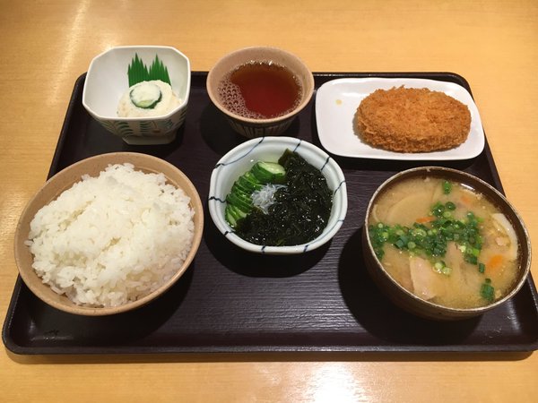 朝からコロッケはないなー てかこれ半田屋系の単品をとって会計するタイプだろ、それぞれのおかずのバランスがおかしいし位置も変だ、コロッケの皿に緑色の要素がなくてポテサラにバランしいてあるのもそれっぽい