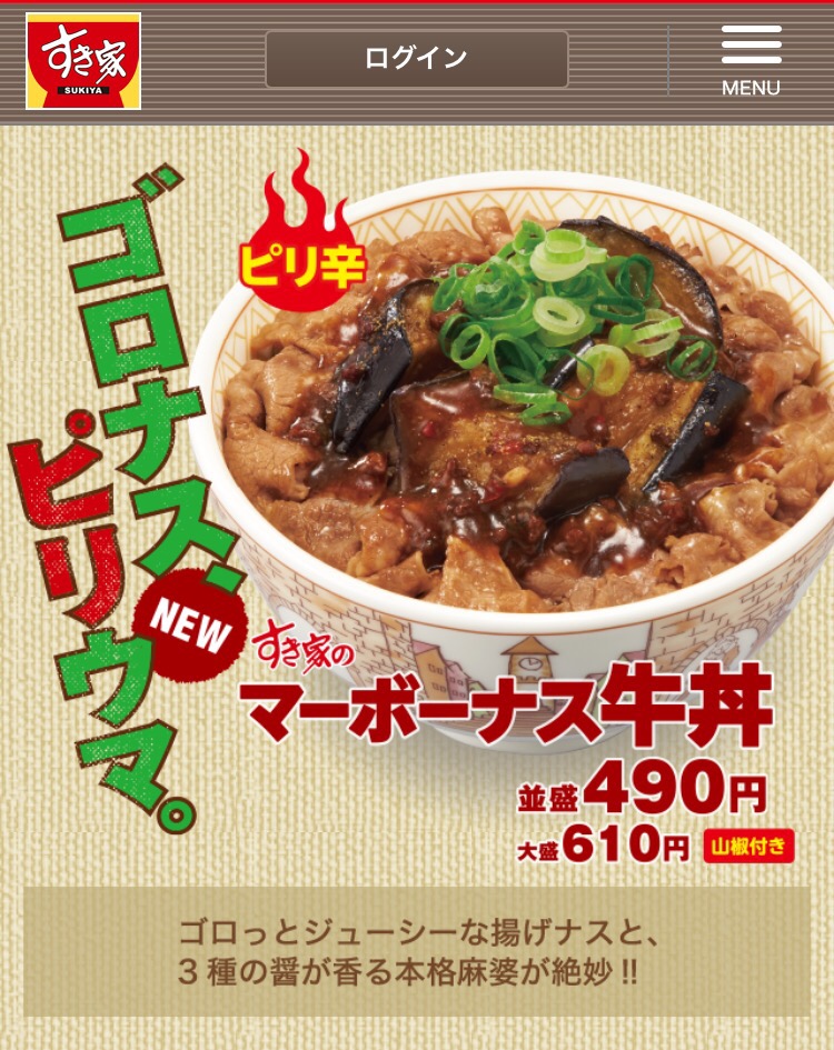 牛丼ではなく、マーボーナス丼の方におんたま付けた方がよかったかも。