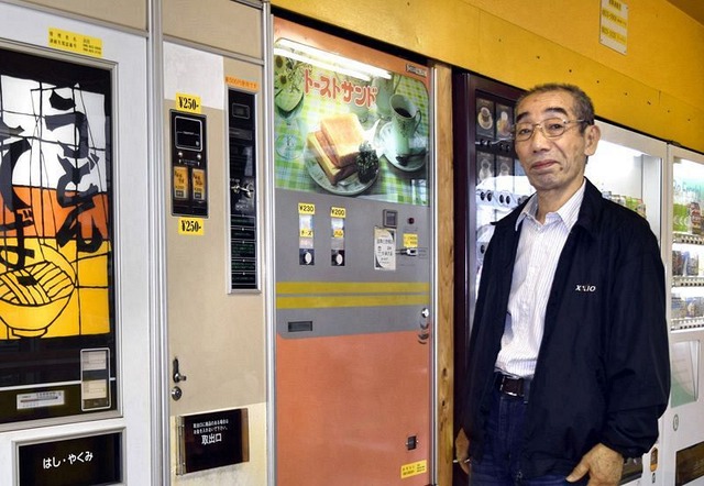 トーストサンド自動販売機と所有者の浜田昿さん(高知市比島町3丁目)
